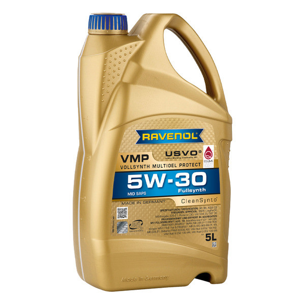 RAVENOL VMP SAE 5W-30 is a universal fuel economy, especially collected engine oil for modern gasoline and diesel engines with and without turbo charger in passenger cars and vans with extended oil change intervals. Extend the lifespan of the particle filter. Due to the specific composition is RAVENOL VMP SAE 5W-30 excellent suitable for use for several of the latest OEM requirements.